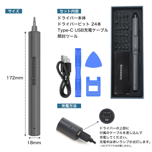付属品 ドライバー本体、ドライバービット24本、USB Type-Cケーブル(50cm)、開封ツール